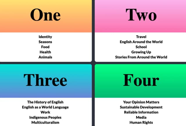 Creaza engelsk er ikke knyttet til årstrinn, men er bygget opp i fire moduler med fem temaer i hver modul som følger elevenes faglige progresjon. Elevene starter med grunnleggende temaer, enkel grammatikk og ordlæring, og avanserer etter hvert som tematikken blir mer kompleks. Vanskelighetsgraden på fraser, setningsoppbygging, grammatikk, tekster og oppgaver øker i de ulike modulene. I tillegg er læremiddelet dynamisk, slik at lærer kan tilpasse innholdet til enkeltelever ved behov. De to første modulene er tiltenkt mellomtrinnet, mens de to siste er tiltenkt ungdomstrinnet, men her står lærer fritt til å bruke temaene når han/hun ønsker.