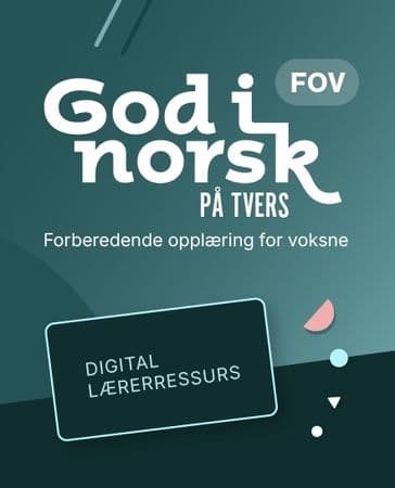 God i norsk på tvers digital lærerressurs er et rikt digitalt innhold som supplerer undervisningen og utvider lærebøkene til hele God i norsk på tvers-serien. Aschehougs serie av læremidler til FOV - Forberedende opplæring for voksne. Her får læreren tilgang til digitale arbeids- og tekstbøker, planleggingsverktøy for undervisningen, innlest lyd, interaktive deltakeroppgaver, undervisningstips, tekster til lytteprøvene, kapittelprøver, autentiske tekster, kopioriginaler og ekstra matematikkressurser.God i norsk på tvers digital lærerressurs kjøpes som enkeltlisens til hver lærer, tilgangen gjelder for ett skoleår av gangen.